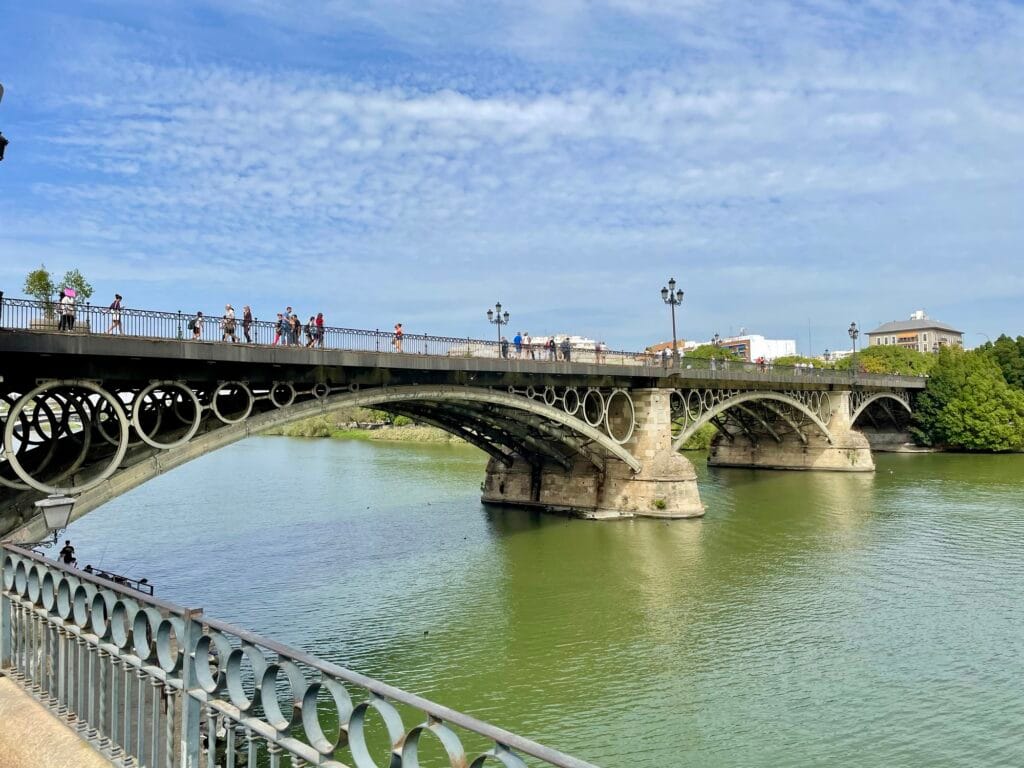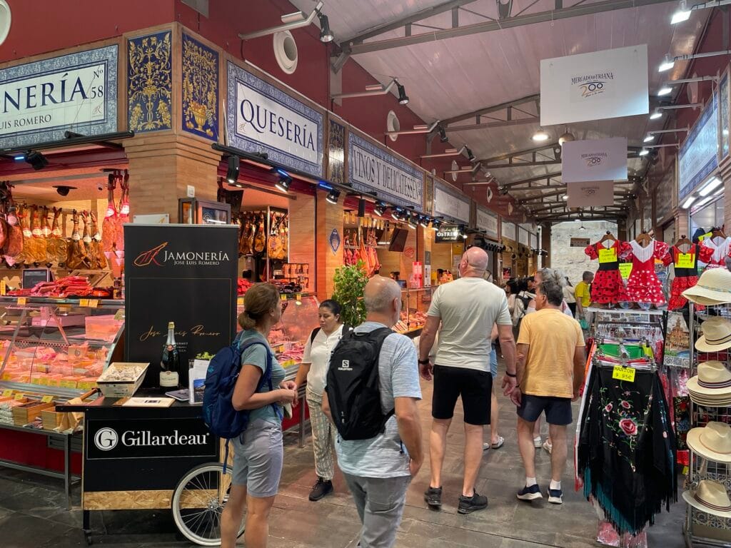 Gabi hatte Hunger. Da wird’s ernst. Und so sind wir vor dem Auspacken von unserem Hotel Ribera de Triana am Fluss entlang zum Mercado de Triana gegangen. Auf den Fluss sind Ruderboote und Ausflugsschiffe unterwegs. Wir kommen an ein paar Restaurants vorbei, die um diese Zeit noch nichts zu tun haben. Dann geht es rechts durch einen Torbogen ein kleinen Sträßchen hoch. Oben ist ein kleiner Platz und links von uns der Eingang zur überdachten Markthalle.
