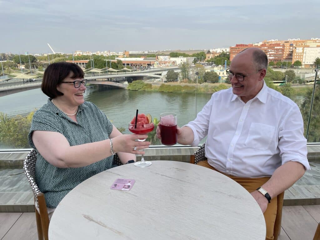 So haben wir dann denn Spaziergang beendet, die Koffer ausgepackt, den Balkon getestet und uns dann für die Rooftop Bar entschieden, wo wir uns von den Mühen des Tages erholen und diese Zeilen schreiben.