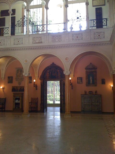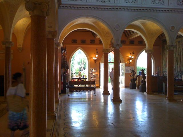 Eines der Probleme: 400 qm Innenhof mit einer Wölbung zu überdachen die dem Himmelsgewölbe entspricht und Möglichkeiten finden, das Gewölbe von innen in abendlichem Blau auszuleuchten. Natürlich inklusive der Sterne des Abendhimmels. So konnte die Society auch bei bewölktem Himmel empfangen werden. Musik dürfte natürlich nicht fehlen, aber damit man die Musik nur hört, läuft ein schmaler Balkon rund um den Innenhof, der die Musiker verbirgt.
