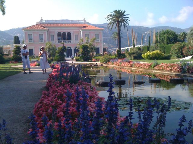 Die junge Frau hatte genug Rothschild im Blut, um über die Mittel, die Ausbildung und das Selbstbewußtsein zu verfügen, alle Regeln der guten Gesellschaft zu brechen und trotzdem deren Ton anzugeben. Weil sie St. Jean Cap Ferrat so ursprünglich fand und im Andenken an eine romantische Schiffspassage auf der Ile de France schnappte sie dem italienischen König das Sahnestück der Landzunge weg und ließ den Hügel Plan schleifen, damit er an das Schiffsdeck eines Ozeanriesen erinnert. Das Haus als Brücke überblickt die verschiedenen Themengärten und gewährt den Blick auf’s Meer nach Backbord und Steuerbord.
